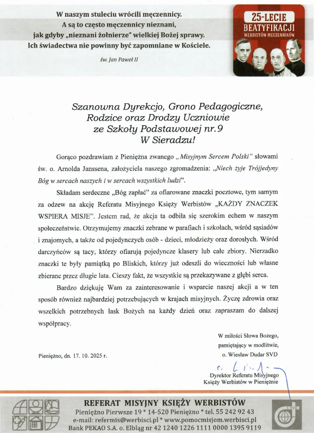 "Każdy znaczek wspiera misje" - podziękowania dla SP nr 9 w Sieradzu
